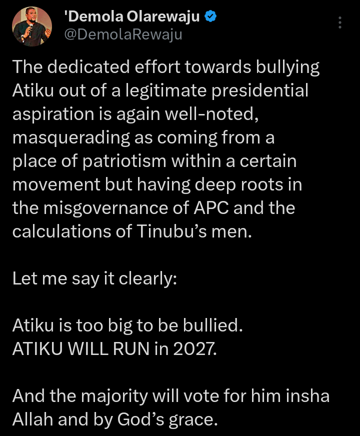 "Let me say it clearly, Atiku is too big to be bullied. Atiku will run in 2027 and the majority will vote for him insha Allah and by God’s grace".