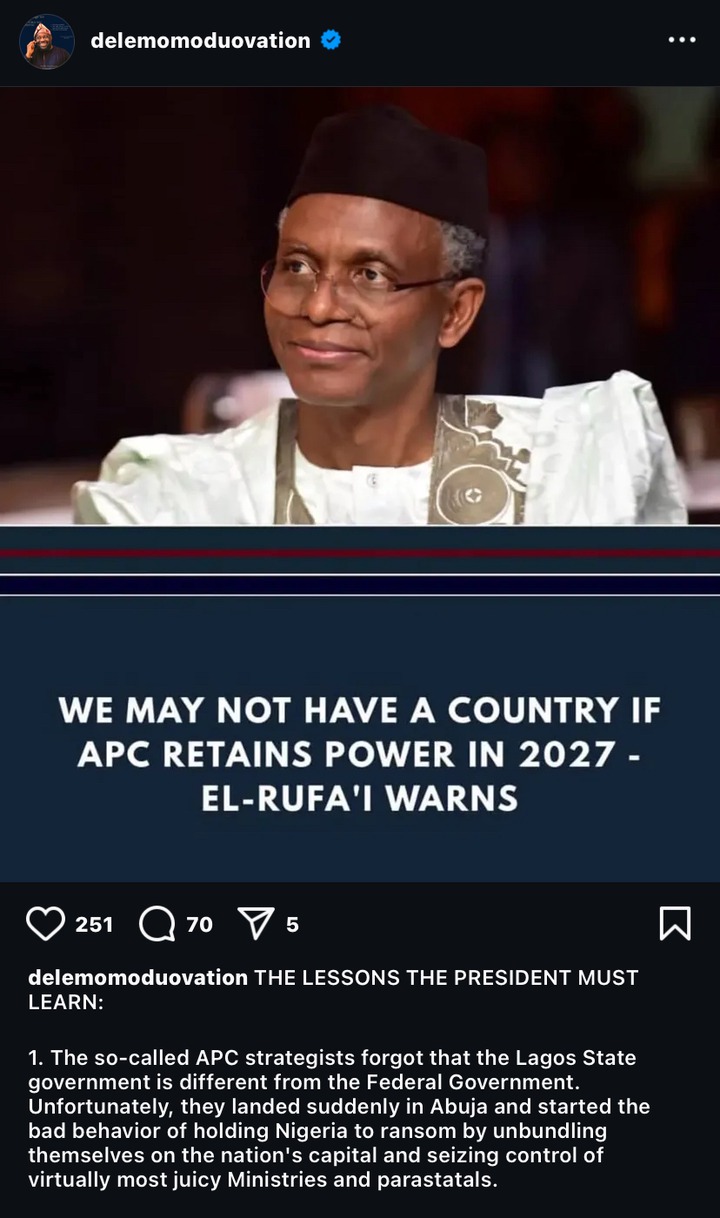 Veteran journalist and politician Dele Momodu has strongly responded to the recent warning issued by former Kaduna State Governor Nasir El-Rufai, who declared that “We may not have a country if APC retains power in 2027.”
