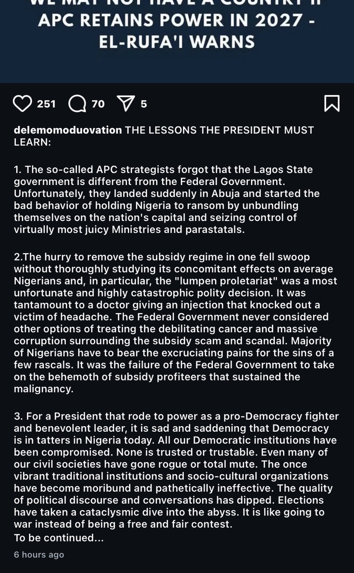 In a lengthy Instagram post on Tuesday, August 5, 2025 captioned “THE LESSONS THE PRESIDENT MUST LEARN,” Momodu offered a scathing critique of the All Progressives Congress (APC) and the Federal Government, accusing them of mismanaging the country and endangering its democratic foundations.