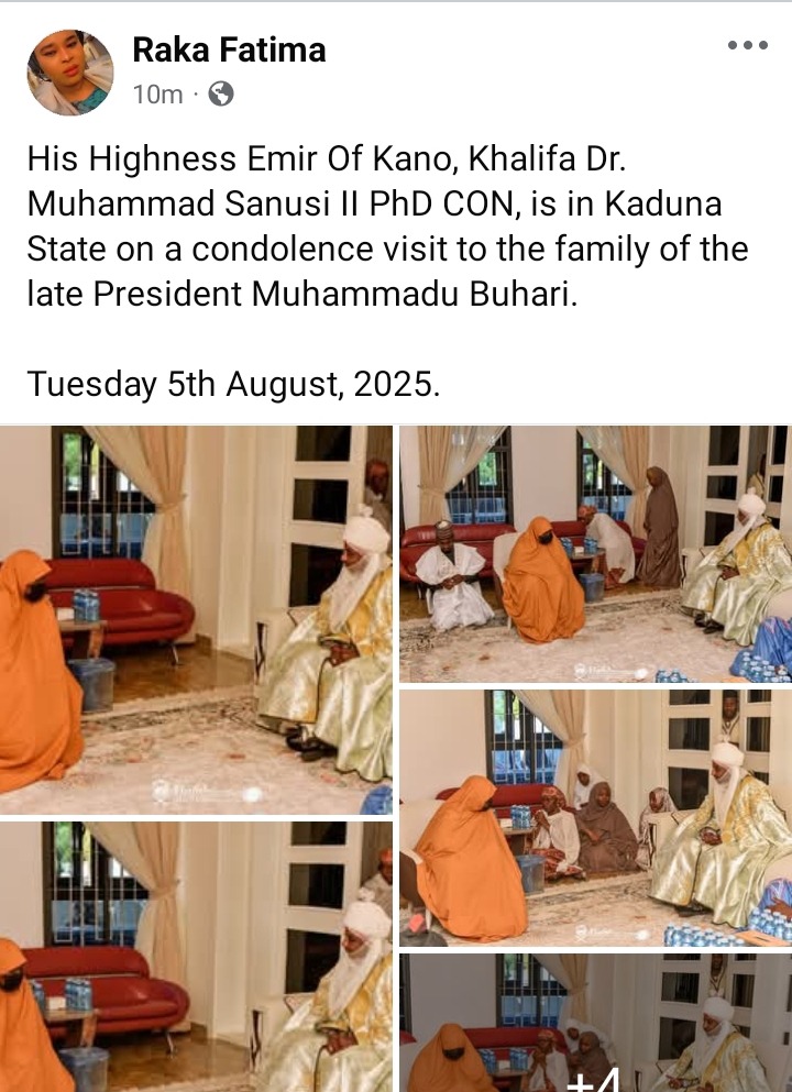 The Royal Media Aide, Hajiya Fatima Raka, His Highness, the Emir of Kano, Khalifa Dr. Muhammad Sanusi II, PhD, CON, paid a condolence visit to the family of the late President Muhammadu Buhari in Kaduna State.