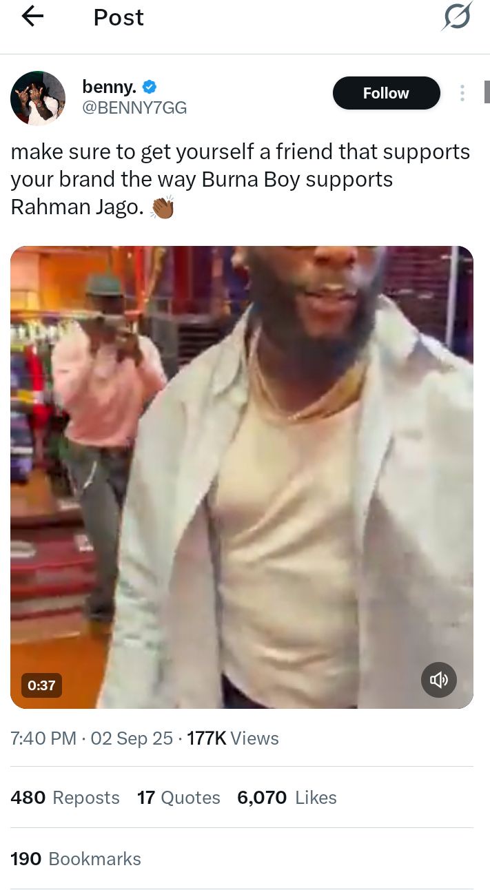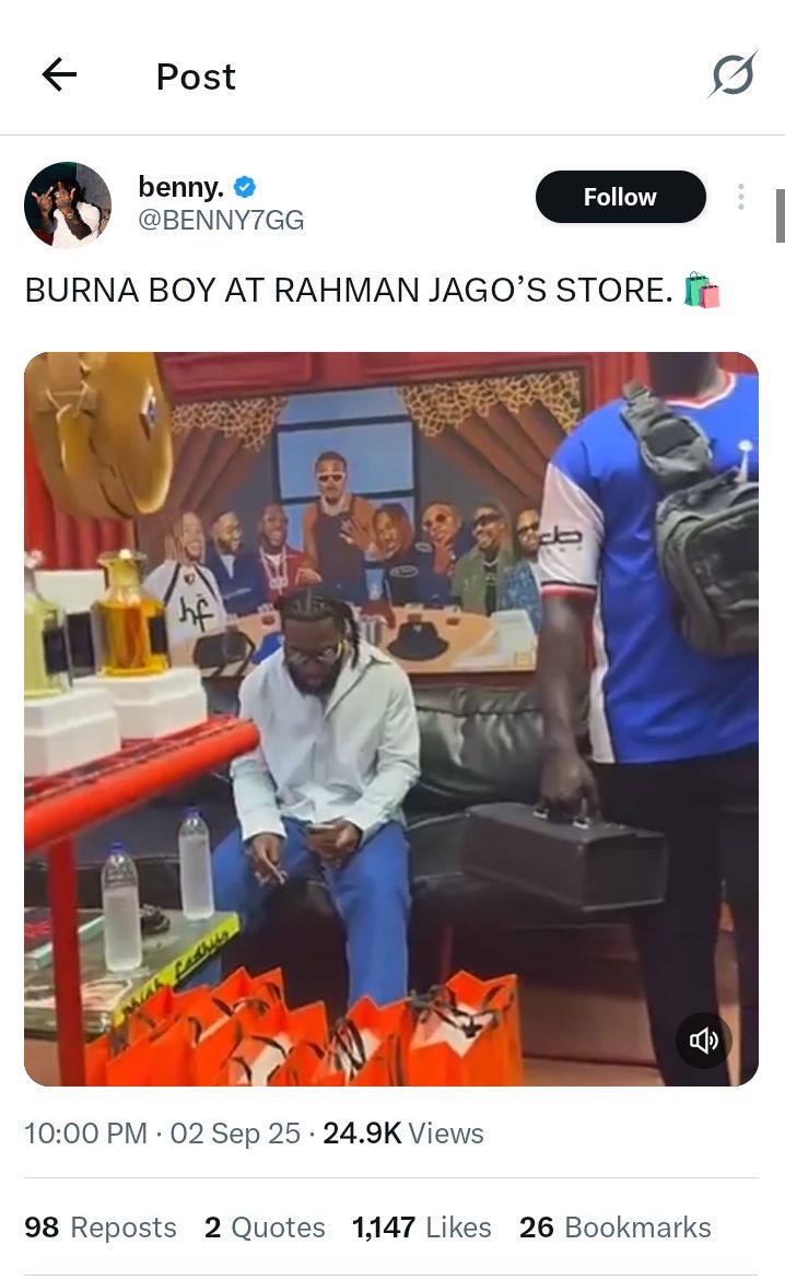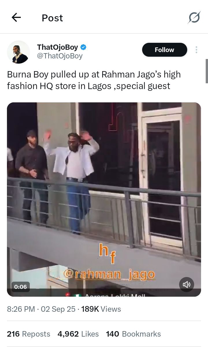 Rahman Jago is a popular and successful socialite, and he has a popular fashion brand and store in Lagos State, Nigeria. Burnaboy and Rahman Jago are really close friends and they have been friends for a very long time. Burnaboy is currently in Lagos State and he decided to pay a visit to High Fashion store in Lagos State, University. High Fashion is the name of Rahman Jago's store in Lagos State. Several celebrities, influencers, media moguls, reality TV stars, musicians, actors and actresses have their outfits from High Fashion.