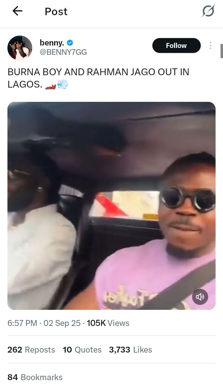 Afrobeats Superstar, Damini Ebunoluwa Ogulu, popularly known as Burnaboy has generated several reactions via social media platforms including Twitter, Instagram, Facebook, amongst others as he visits his socialite friend and billionaire business man, Rahman Jago.