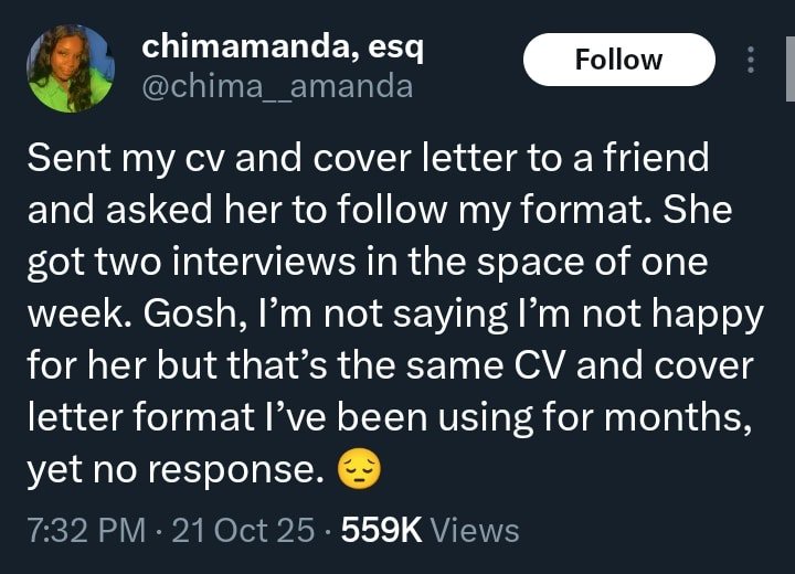 She wrote: “Sent my CV and cover letter to a friend and asked her to follow my format. She got two interviews in the space of one week. Gosh, I’m not saying I’m not happy for her but that’s the same CV and cover letter format I’ve been using for months, yet no response.”