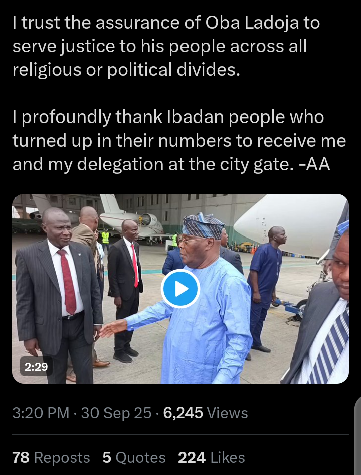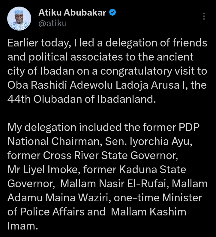 According to Atiku Abubakar, he visited Ibadan because he couldn't attend the coronation ceremony of Oba Rasheed Adewolu Ladoja as the 44th Olubadan of Ibadan.