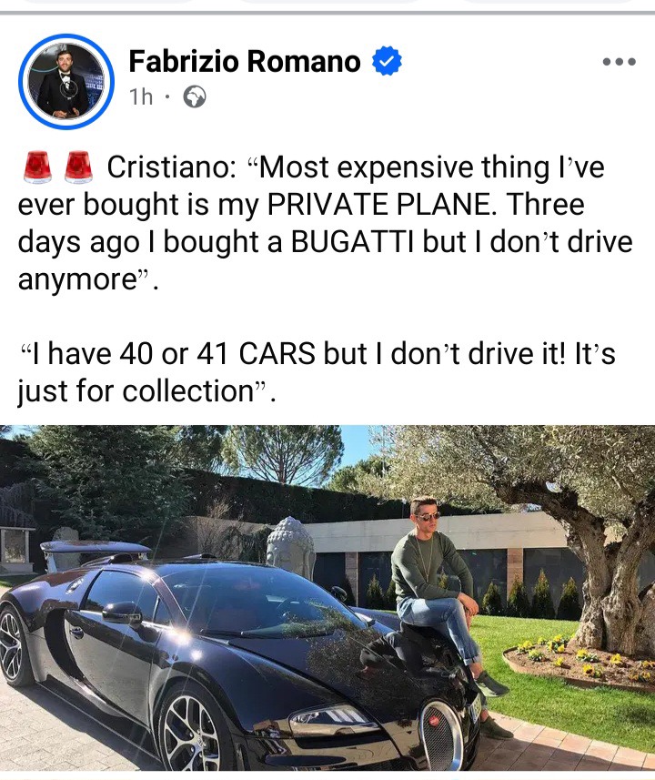 The Portuguese superstar, who has long been associated with glamour, hard work, and a taste for luxury, seems to have reached a stage where his wealth is less about enjoyment and more about appreciation. The mention of a private jet as his most expensive purchase didn’t surprise many, considering Ronaldo’s global commitments and frequent travels. However, the idea of owning over 40 high-end cars — including brands like Bugatti, Ferrari, and Rolls-Royce — only to keep them as collectibles, reflects how success can change one’s relationship with material things.