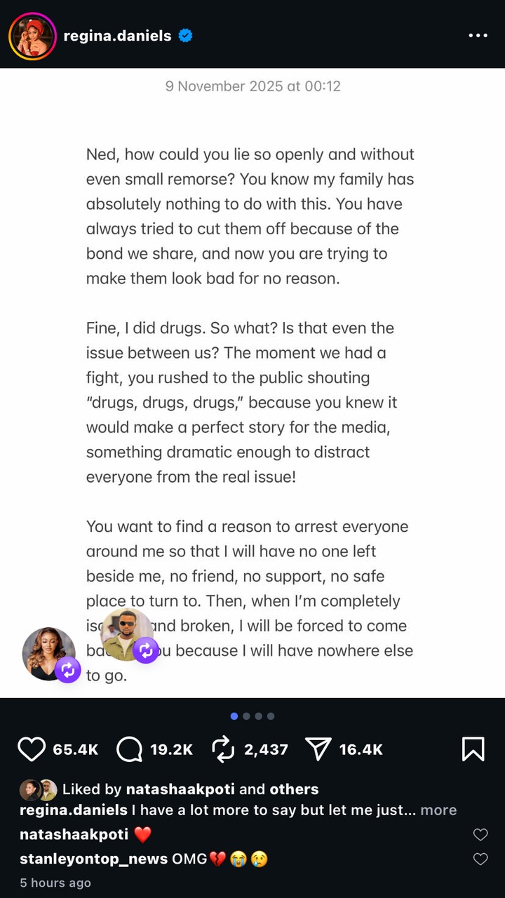 Popular Nollywood actress Regina Daniels has sparked controversy after releasing a four-page document in which she accused her estranged husband, businessman and politician Ned Nwoko, of lies, manipulation, and emotional abuse. In the document shared at midnight, Daniels confronted Nwoko, alleging that he fabricated claims about her drug use to tarnish her family’s image and divert attention from deeper issues in their relationship.