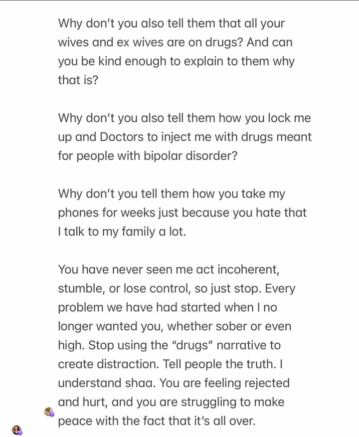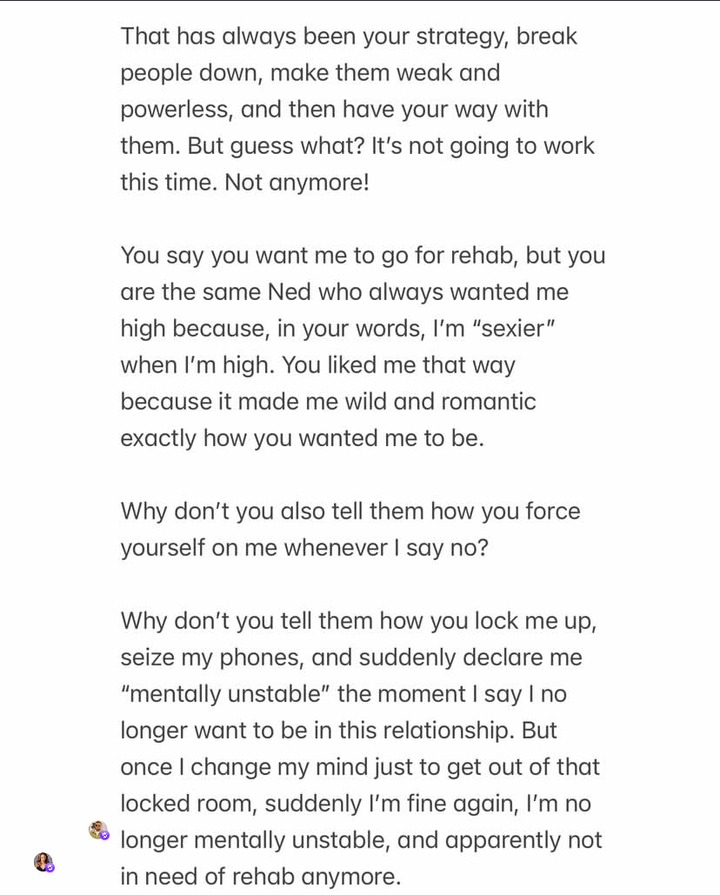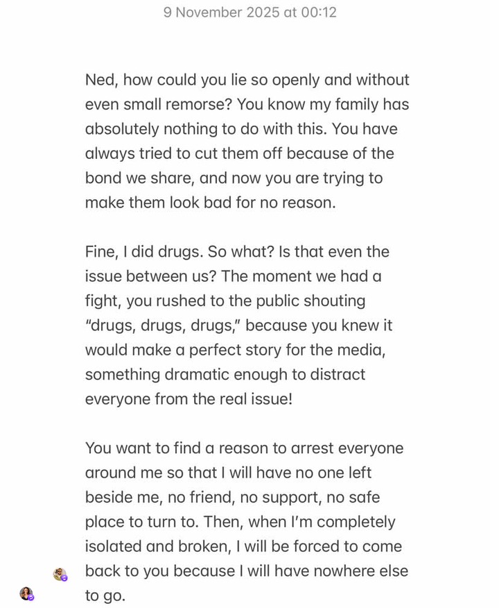 “Ned, how could you lie so openly and without even small remorse? You know my family has absolutely nothing to do with this,” she wrote. “You have always tried to cut them off because of the bond we share, and now you are trying to make them look bad for no reason.” Daniels admitted to using drugs in the past but denied it being the core problem between them. She accused Nwoko of exploiting the issue to gain public sympathy and isolate her from friends and family.
