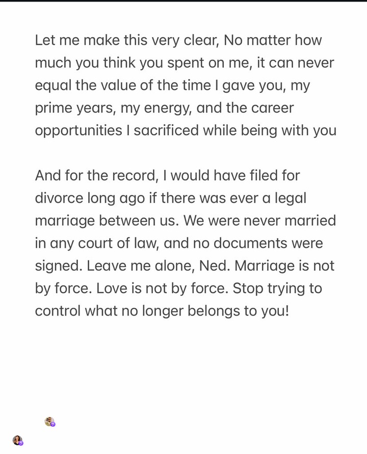 In the explosive letter, Daniels also denied being legally married to Nwoko. “I would have filed for divorce long ago if there was ever a legal marriage between us,” she wrote. “Leave me alone, Ned. Marriage is not by force. Love is not by force.”