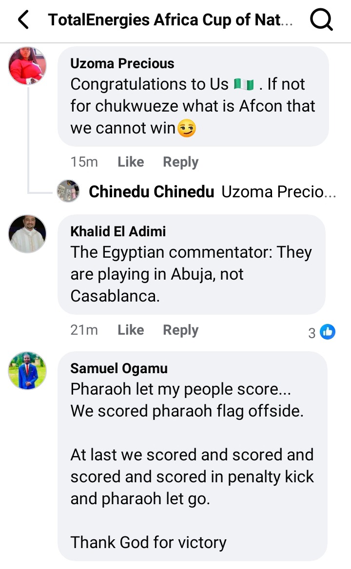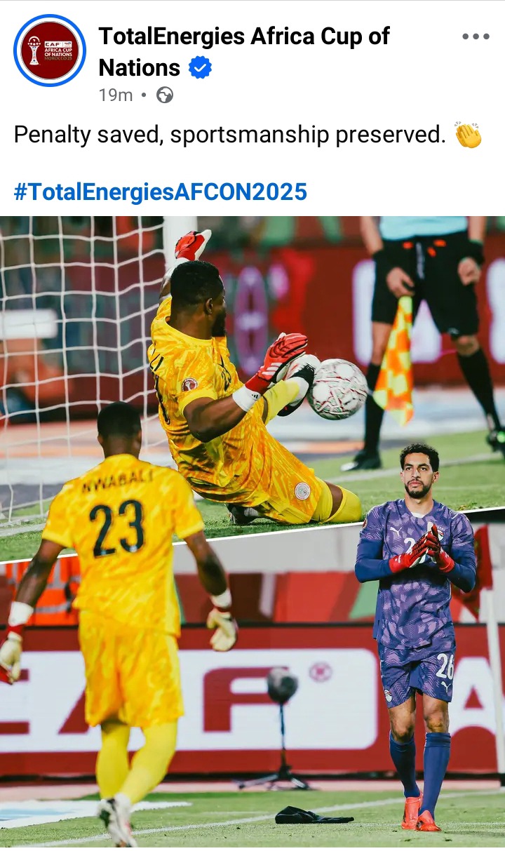 Sharing photo of Egypt goalkeeper, Mostafa Shobeir clapping for Stanley Nwabali after his penalty save, CAF posted on Facebook: "Penalty saved, sportsmanship preserved."