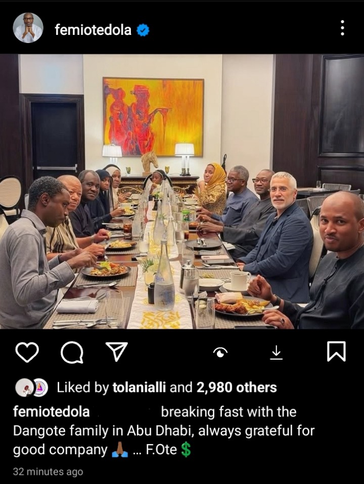 Nigerian billionaire businessman Femi Otedola joined the Aliko Dangote family on Monday evening to break fast at Dangote’s residence in Abu Dhabi, United Arab Emirates, during the holy month of Ramadan.
