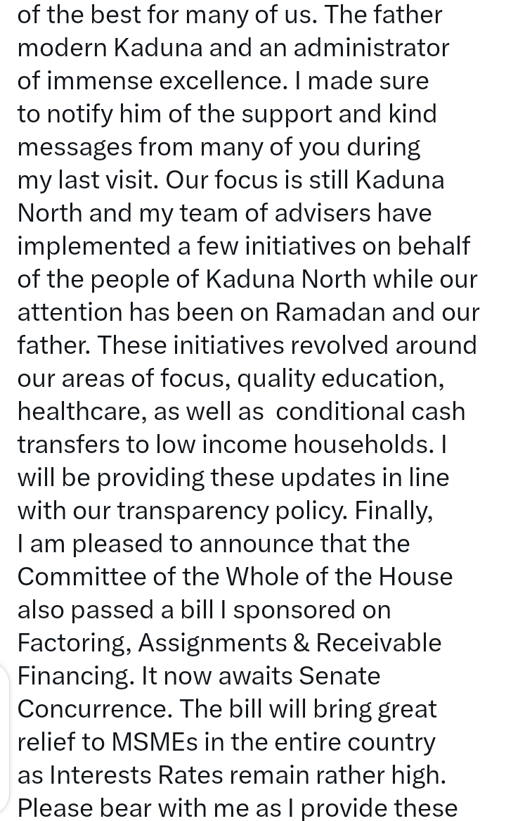 “I made sure to notify him of the support and kind messages from many of you during my last visit,” Bello El-Rufai wrote. “Our focus is still Kaduna North, and my team of advisers have implemented a few initiatives on behalf of the people of Kaduna North.”