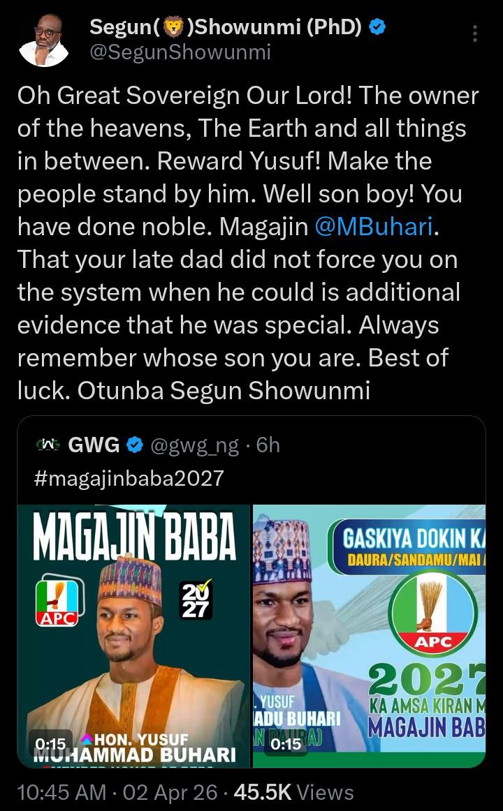 Former governorship candidate of the Peoples Democratic Party (PDP) in Ogun State, Segun Sowunmi, has reacted to the emergence of a campaign poster by Yusuf Buhari, who is reportedly seeking election into the House of Representatives.